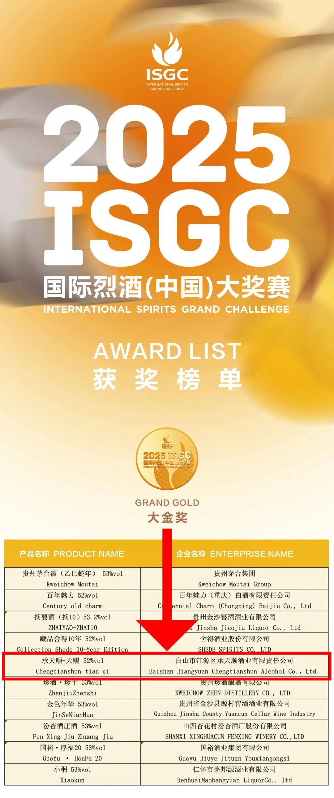 热烈祝贺承天顺酒业荣膺2025ISGC国际烈酒(中国)大奖赛 “大金奖”!这不仅是品质的国际认证,更是东北白酒走向世界的重要一步。从长白山麓到全球舞台,承天顺以实力证明:中国好酒,不止在西南,也在东北的黑土地中醇香绽放!