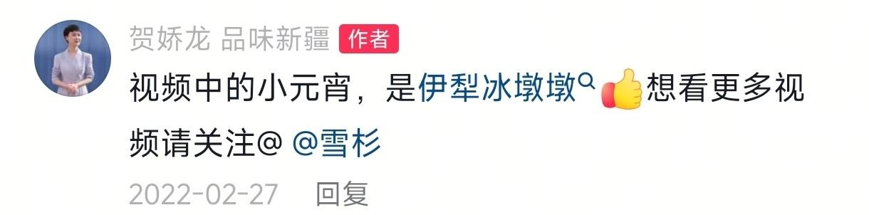 贺娇龙在评论区说:视频中的小宝宝叫小汤圆,也叫小元宵,是伊犁冰墩墩。