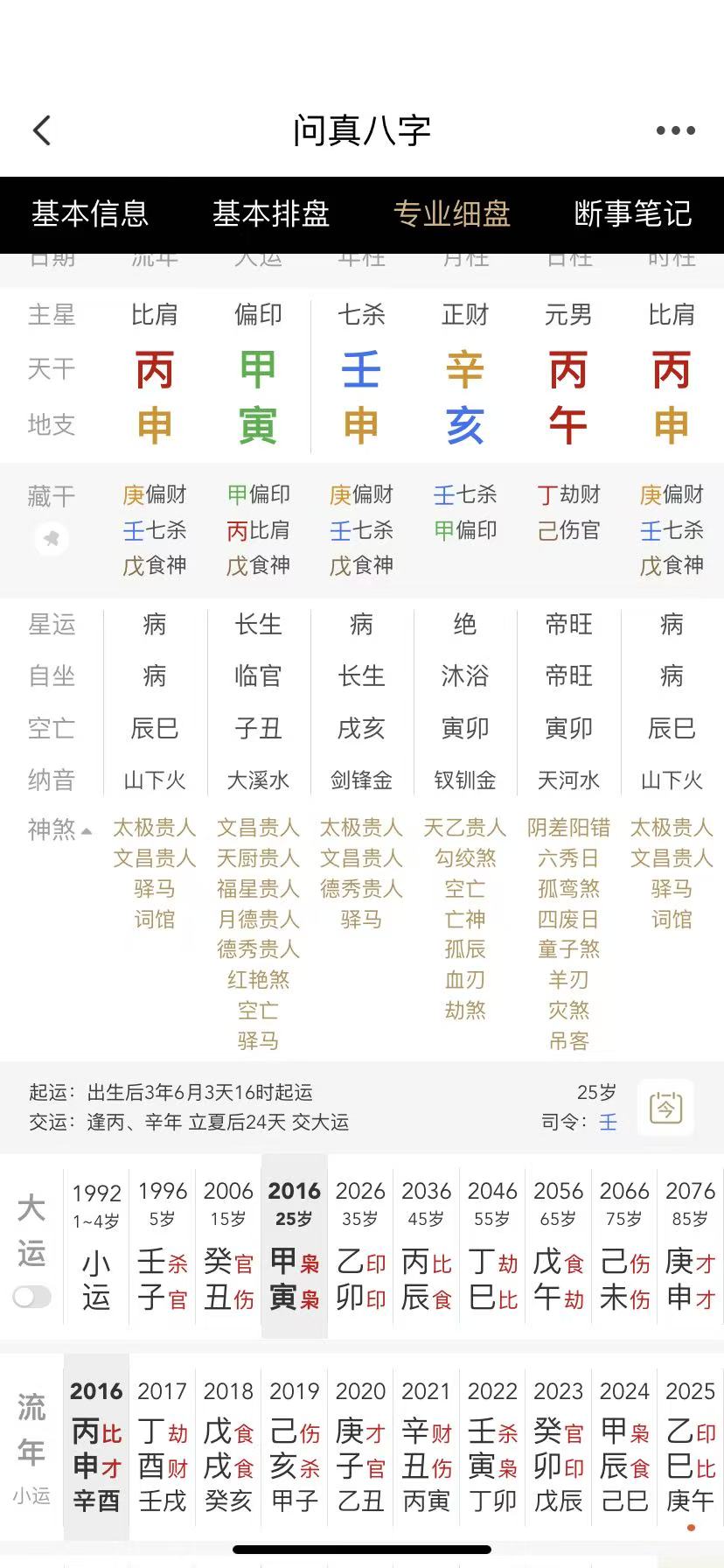 婚姻:婚姻的判断方法首先日主立的住,财官也立的住,只是犯了点毛病,劫财克才,所以财星有点进不来。我们来看大运提示,25岁之前财官一路泄身,首先我们要让日主旺起来才能担得住财官,25到35走甲寅乙卯印年,肯定是结婚的年份,16,17年劫财克才,属于桃花,22年234年官印相生,结婚的应期。