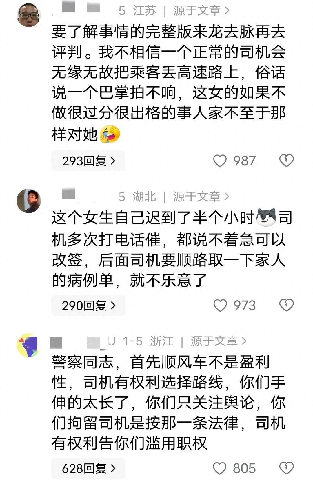 有的网友则认为,女乘客迟到20多分钟,有错在先。顺风车不是网约车,理应按司机线路,所以女乘客要求太多,支持司机把她放下。