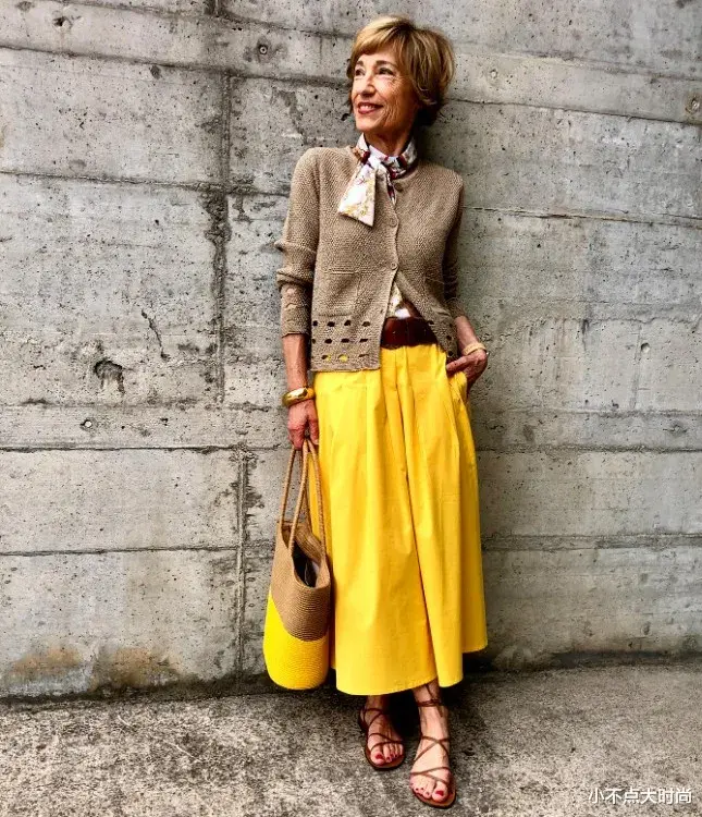 这套裙装搭配也是解开下面两粒扣来强调高腰线的方法,视觉显高很自然,又有时尚感。搭配一条黄色的半身裙,明媚时尚,优雅得体,谁说老了就不能如此灿烂有活力呢?▼