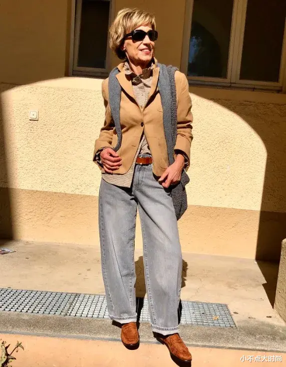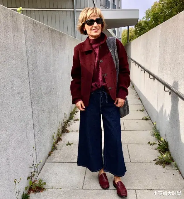 勃艮第红色的外套,浓郁又大气,也只有年岁沉淀下来的气质才能驾驭得如此自然而高级。搭配深蓝色的牛仔阔腿裤,又有时尚感,原来老了也能穿得这么恣意光彩,这么气质高贵又有品位。▼