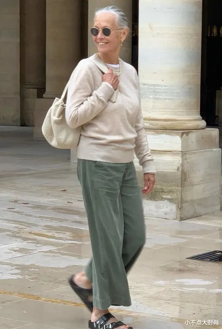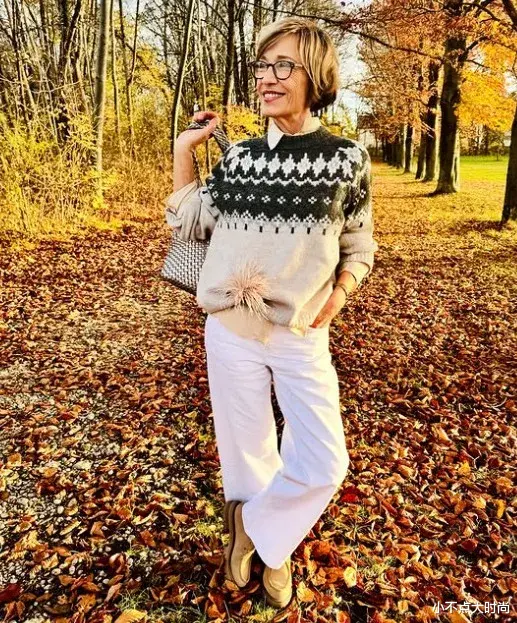这位老奶奶穿费尔岛元素的毛衣就很有时尚眼光,温柔风情很别致,内又叠穿白衬衫,丰富层次感,尽显时尚细节。下身搭配白色的直筒裤,整套浅色系穿搭,干净温柔,视觉显高又有高级感。▼