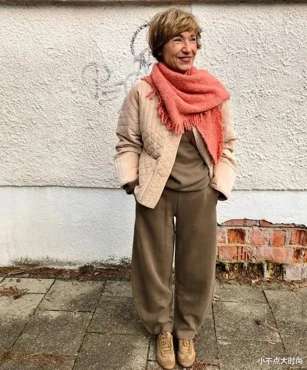 低饱和度的彩色系,淡淡治愈的色彩呼应了年龄沉淀下来的包容感。低饱和度的橘粉色围巾衬得气色很好,提亮整套浅大地色系的穿搭,淡淡的充满高级感。让整套搭配温和舒服又有时尚亮点。▼
