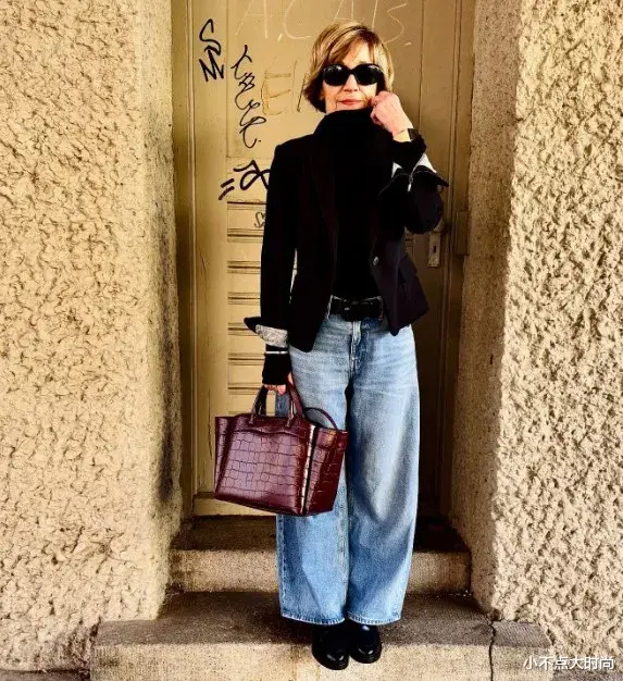 上身穿基础款的合身黑色短外套,下身穿基础款的牛仔阔腿裤,阔腿裤可以修饰下半身,显高又显瘦,上了年纪也尽可大胆地穿,大方又时尚。一整套上紧下松,简约日常又时尚。▼