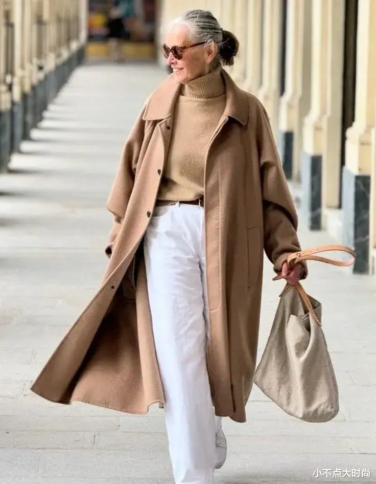 矮个子老了也能穿长款外套,内搭就学她这样打造出高腰线,一条高腰的阔腿裤、把上衣塞进裤子内,整体就利落显高,大方有气场。▼