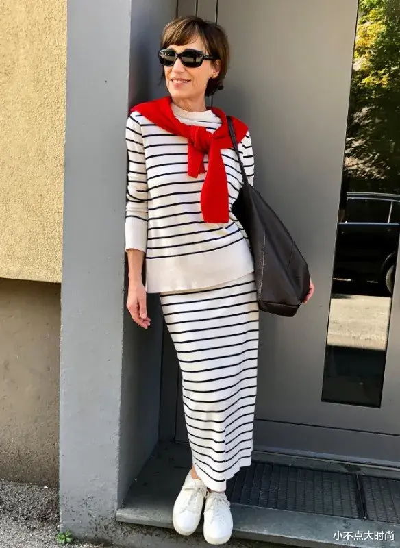 条纹的针织套装裙穿搭省去了搭配精力,简约耐看又优雅大方。红色的针织衫作为披肩,增添时尚细节,提亮整套搭配。▼