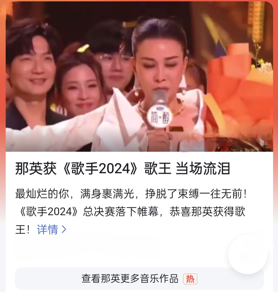 让我们一起为那英鼓掌喝彩吧!同时也要感谢《歌手2024》这个舞台给了所有参与者展现才华的机会。无论结果如何,每位选手都是值得尊敬的英雄,他们用歌声传递着爱与梦想的力量。
