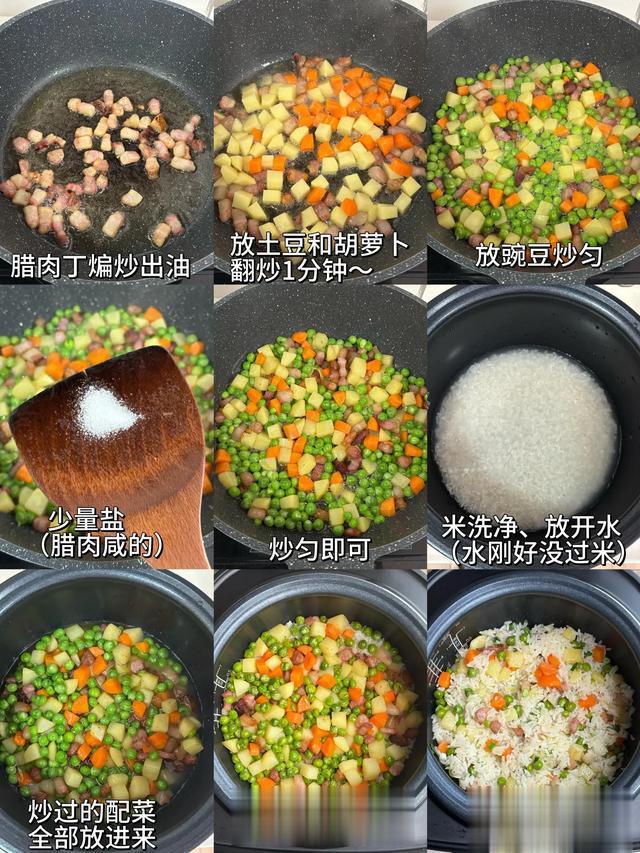 热锅后,先把腊肉丁放进锅里炒到微微冒出油花,那香味一下子就出来啦。然后把胡萝卜和土豆也倒进去翻炒1分钟,等微微变软之后,就可以把豌豆放进去咯,放少量的盐,快速翻炒几下。