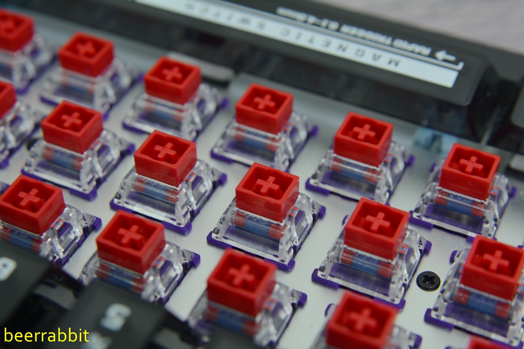 另外,万磁王轴还有机械轴没有的优点,它的触发机制是根据磁轴中磁铁位置的改变带来霍尔传感器的反应来实现触发,万磁王轴的初始磁通量:100±15GS(PCB1.2mm)/90士15Gs(PCB1.6mm),触底磁通量:640士60Gs(PCB1.2mm)/480士60GS(PCB1.6mm),所以我们可以通过键盘的驱动设置来触发行程。用户可以根据个人喜好跟使用习惯,设置轴体的触发点,如果用户的反应够快,可以设成比银轴更迅捷的触发;相反,用户喜欢长触底,可以设成较长的触发。我觉得这个才是磁轴给我最不一样的感受。