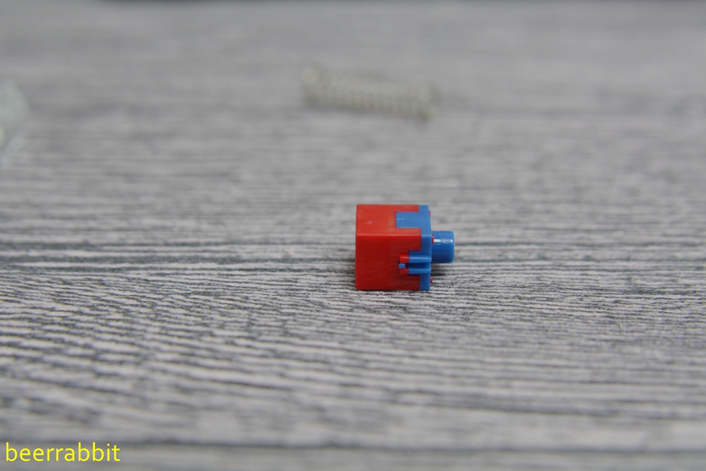 轴芯按钮上下分为红蓝两个部分,这个颜色让我想起了磁铁代表两极的传统颜色。这两部分由榫卯方式连接,可以增加零件适配的灵活度跟可玩性,因为用这种方式以后还能支持上下按钮采用不同颜色,不同材料的搭配,以及支持不同的结构拼装组合。