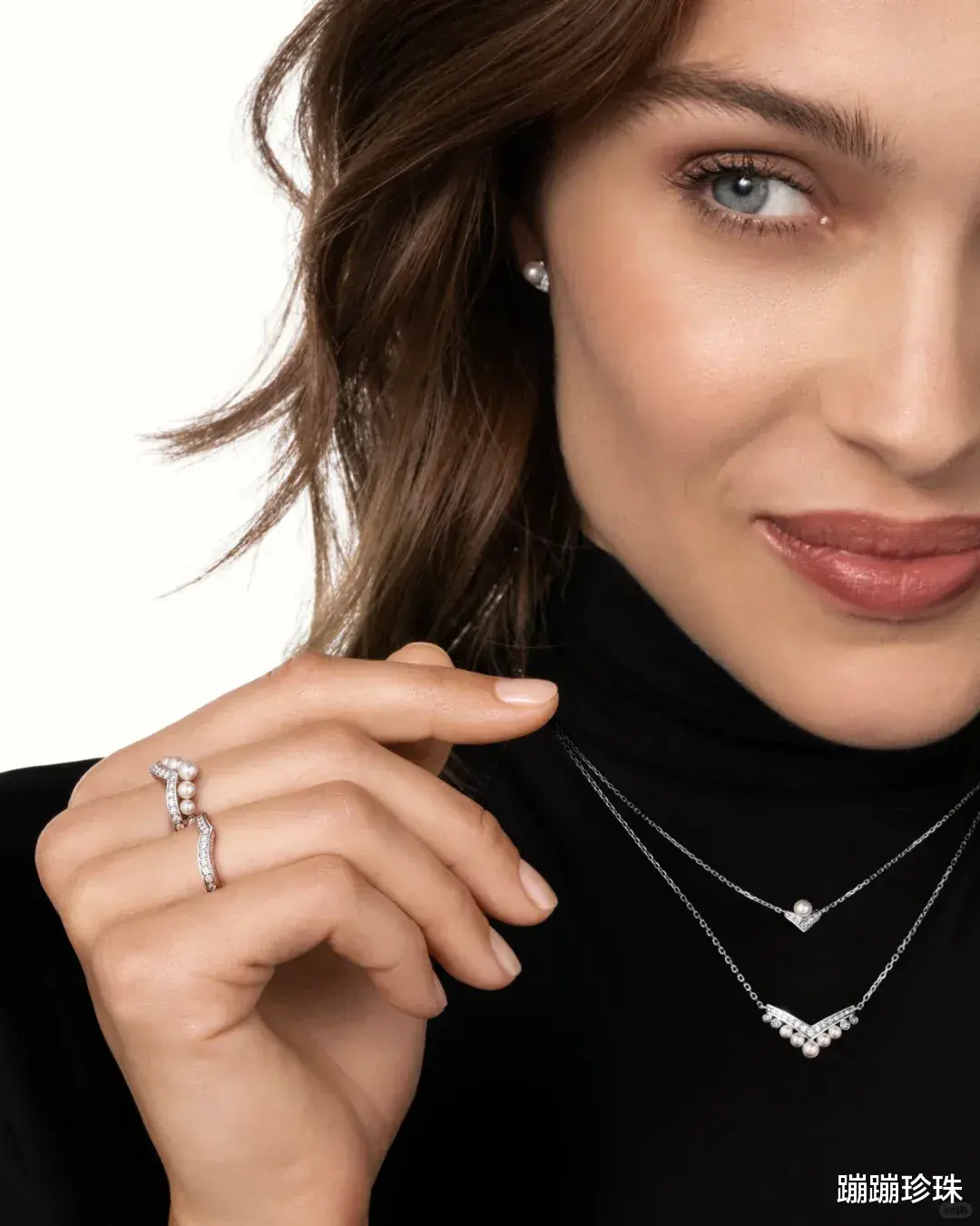 尚美的Joséphine系列是难得的珍珠系列。Joséphine系列沿袭了“冠冕”造型以“V”形标志与水滴形元素,钻石和“小灯泡”Akoya的结合,看起来就非常闪。