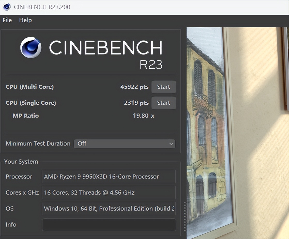 ▲X3D鸡血模式2.0的最大性能模式下,CINEBENCH R23多核心和单核心渲染成绩达45922pts和2319pts。