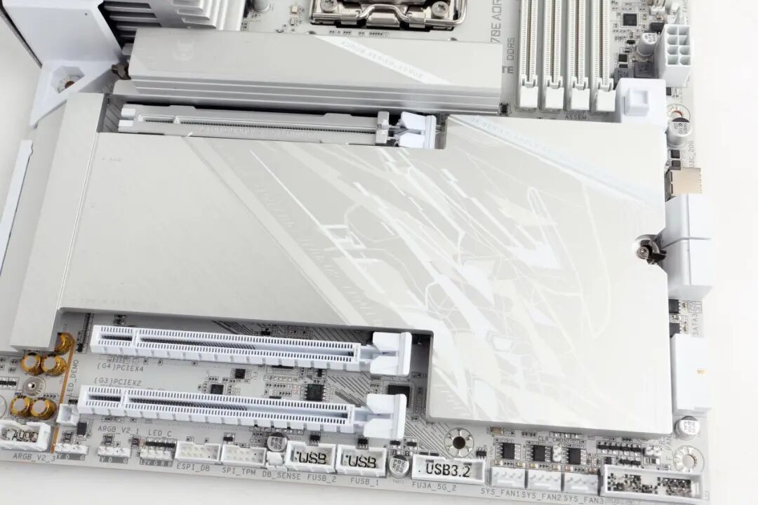 存储扩展方面,技嘉X870E X3D冰雕主板堪称“满血配置”,配备双PCIe 5.0 x4 M.2 SSD插槽与双PCIe 4.0 x4 M.2 SSD插槽,充分满足大容量、高速存储需求。值得称赞的是,每个SSD插槽都标配导热贴+散热装甲的双重散热防护,且散热装甲采用快易拆设计,用户仅需旋转旋钮便能轻松拆装。尤为用心的是,与处理器相邻的PCIe 5.0 SSD插槽散热装甲,延续了供电散热器的多剖沟设计,预留多个气流通道与出入口,能充分利用处理器风冷散热器或机箱风扇形成的气流,快速带走散热装甲上的热量。这一设计尤其适合搭载顺序读写速度更快、发热量相对更高的PCIe 5.0 SSD,可解决高速存储的散热痛点。