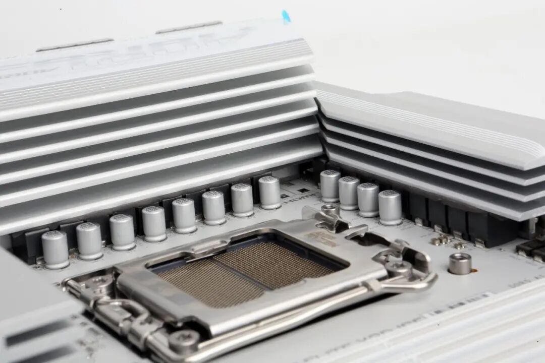 技嘉X870E X3D冰雕主板在散热设计上非常用心,其配备大面积供电鳍片散热装甲,以优化散热架构搭配散热面积扩容10倍的VRM散热模组,全面覆盖供电电路中的电感、SPS MOSFET等核心高热元器件,大幅提升热交换效率,确保供电区域即便在满负荷工况下也能维持低温稳定运行。每块散热片下方均铺设了导热系数达7W/m·K的高效导热垫,能让电感、MOSFET与散热器紧密贴合,实现热量的快速传导。主散热模组还加入多剖沟设计,通过预留多个气流通道与出入口,确保气流顺畅穿行,进一步强化散热效能。为提升散热表现,主板更搭载全覆盖式PCB金属背板——不仅能辅助提升整体散热效率,更能强化PCB板的结构稳固性,有效避免长期使用后的变形问题。