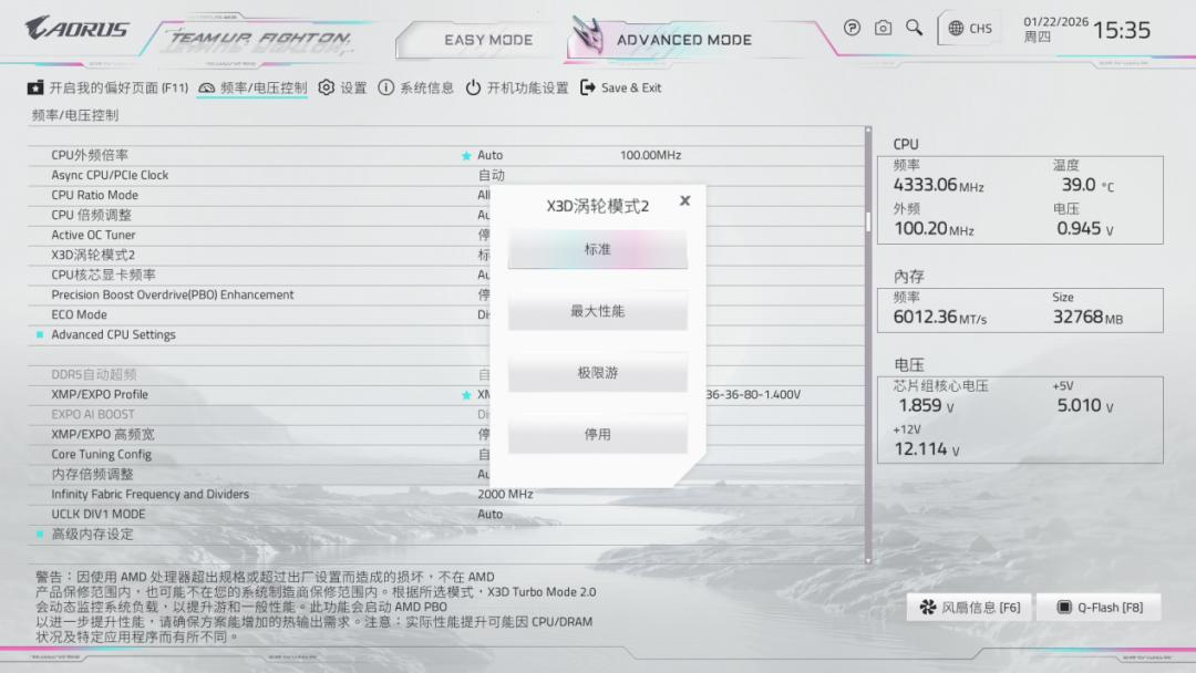 ▲技嘉X3D系列主板的X3D鸡血模式2.0功能,在BIOS中被命名为“X3D涡轮模式2”,包含标准、最大性能模式与极限游戏三个可选模式,也可以选择停用。