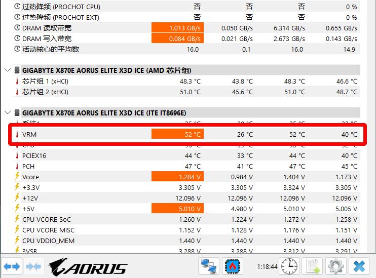 ▲在15℃的环境温度下,技嘉X870E X3D冰雕搭配锐龙9 9950X3D处理器,经过30分钟的满载测试后,主板的MOSFET最高温度仅为52℃,平均温度更是低至40℃。