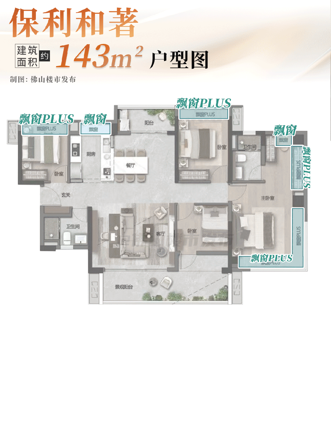再加上新规设计,飘窗可落地拓展出更多的空间,让其比市面上其他同等面积的户型多一房,吊打建面约130平的旧规户型。