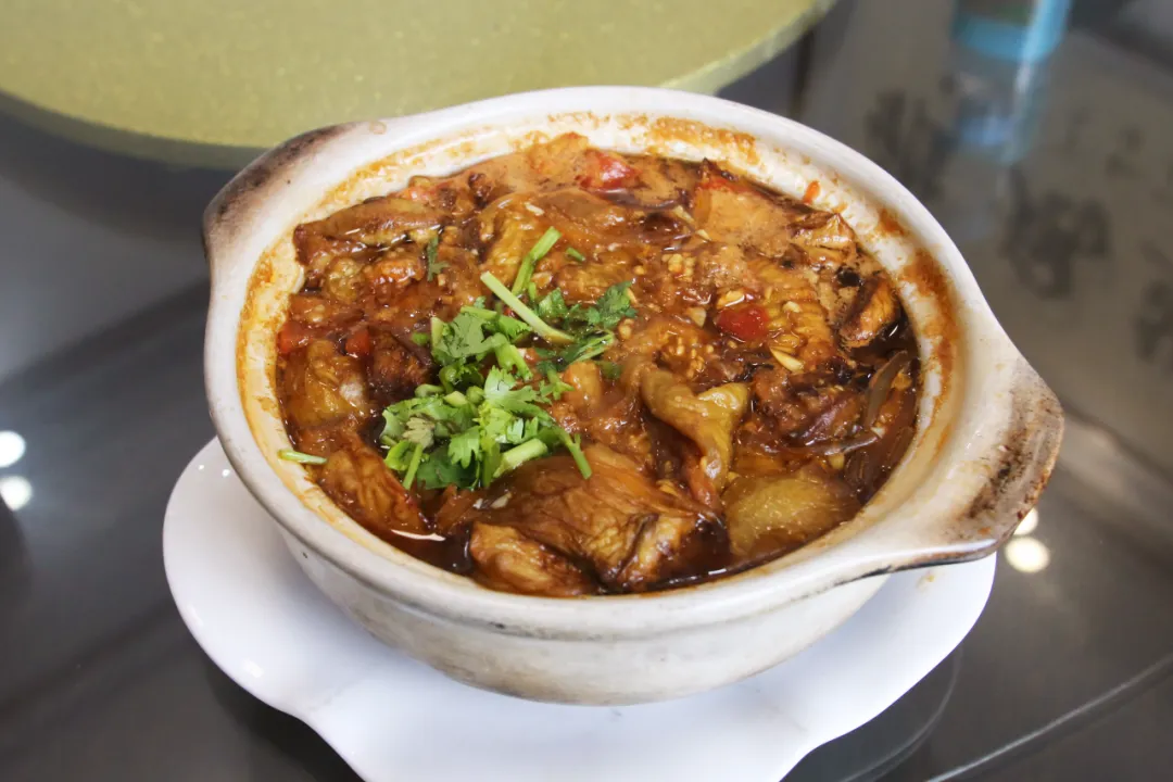 如今的茄子砂锅,看起来同往常一般朴素,实际背后的工序暗藏玄机。茄子以菱形厚片斜切,未经预处理,以保留其自然鲜甜。180摄氏度油温下锅,快速炸至表皮金黄微酥,呈封闭状,如此才能锁住内里的鲜嫩绵软。