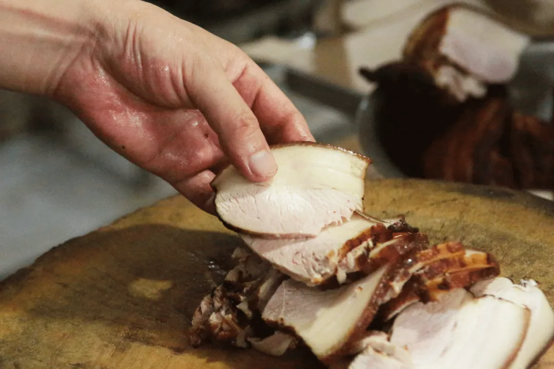 肉皮朝下,先煮半小时左右,再焖制3小时,火候自在心中。卤制好的肉切片,薄则一枚硬币厚度,厚则不宜超过两枚硬币厚度,师傅的刀工在这个环节有了具象化的体现。