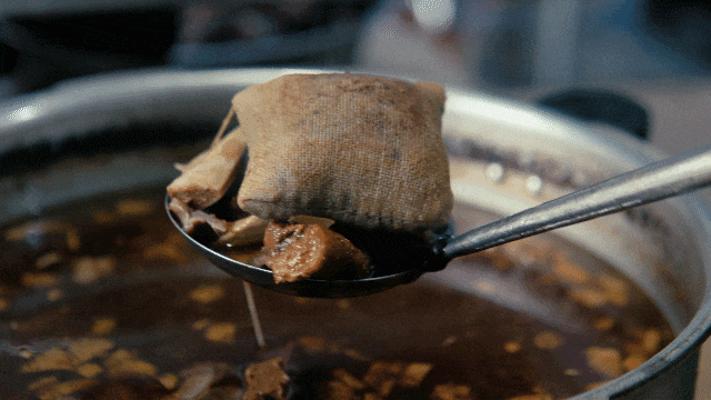 所选用的五花肉,每一块都切得方方正正,不留一丝多余。细心观察便会发现,没有比这更标准的五花肉了,因为肥瘦分层不明显的五花肉是入不了眼的。50多种天然中草药自制而成的卤料包,成就一块好焖肉秘笈。