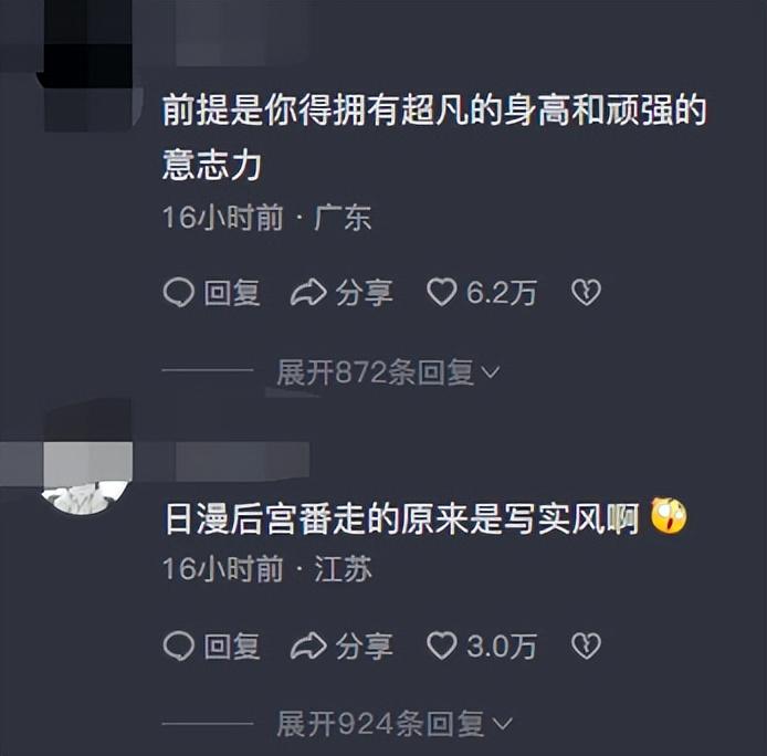 网友炸锅了这位网友调侃说,前提是你得拥有超凡的身高和顽强的意志力,日漫后宫番走的原来是写实风!