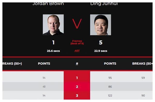 比赛一开始丁俊晖克服慢热进入状态很快,首局轰出单杆59分,以95比14拔得头筹,第二局开打彼此都有失误,丁俊晖把握住了机会多次上手,通过零敲碎打以86比41赢得缠斗,第三局开打,丁俊晖轰出单杆90分状态火爆,以122比14赢下此局,第四局乔丹布朗很明显加强了进攻,轰出单杆55分,以79比41扳回一局。