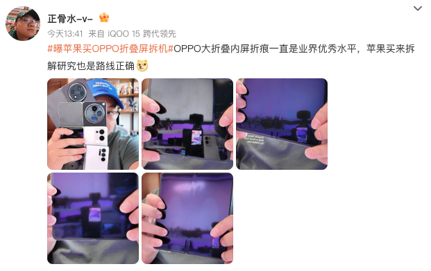 爷的青春回不去了啊?!以前是国产手机拼命研究苹果,现在轮到苹果研究国产手机了?最近OPPO Find N5被苹果买回去研究这消息传得沸沸扬扬的,而且最重要内部消息说苹果研究完之后发现OPPO Find N5的折痕控制很难超越,看来现在中国制造真的已经进化成“Pro Max”版本了,连苹果都得对标OPPO。