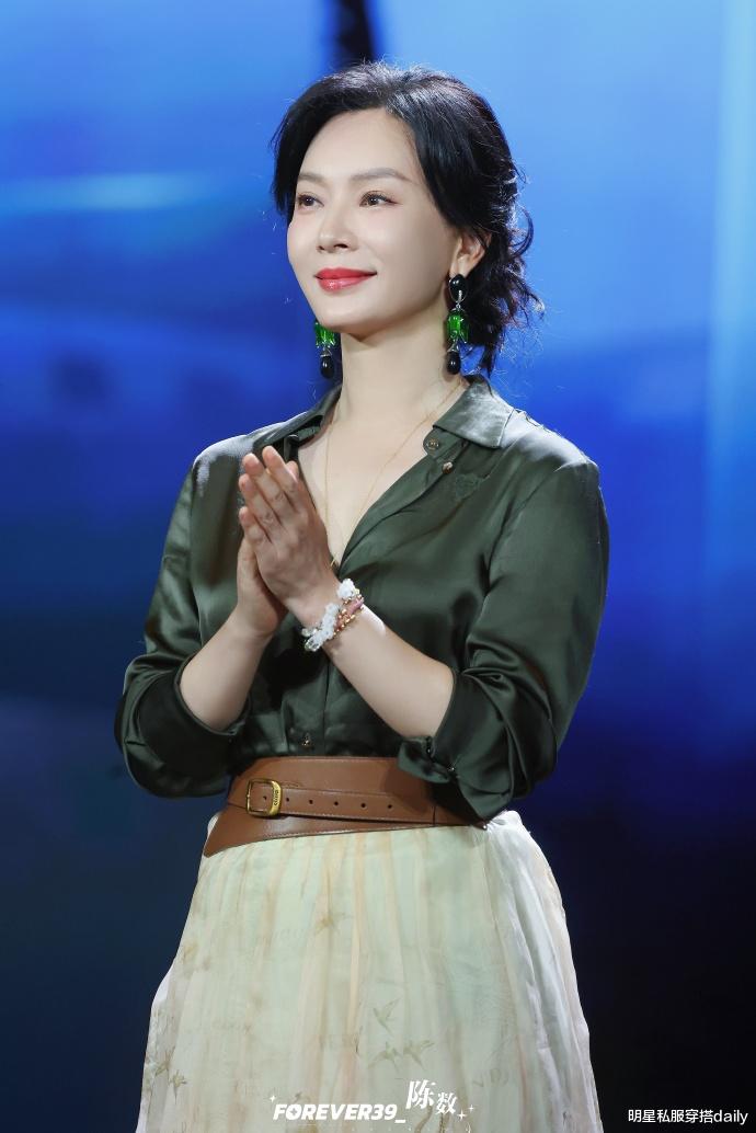 很多人会觉得穿墨绿色,会显得老气没有活力感!但其实搭配好了配饰,减龄效果也很明显!比如陈数搭配了一对绿色长耳环,立马就打破了沉闷与老气,让造型变得更加时髦了起来。并且,她的配饰耳环和衬衫的颜色也是与服装带有呼应的,看起来十分的协调。