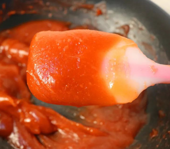 6缓缓地将备好的山楂糊倾倒入不粘锅中,接着徐徐地把温度调整至适宜状态,随后始终用锅铲在锅内翻动、翻炒食材,直至整个过程完结。