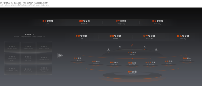作为行业安全技术的先行者与引领者,吉利在“全域AI”技术体系的赋能下,以“AI为纲 责任为本”,基于原有的“全域安全”技术体系进阶打造“全域安全2.0”技术体系。结合智能时代的安全新需求和新挑战,“全域安全2.0”技术体系秉持“以人为尊”理念,通过技术升级、能力突破与范式创新,将侧重“整车安全”的视角升级为“人-车-路-云-星”的生态视角,旨在贯穿用户出行全场景、覆盖出行全领域、联动出行全生态;并以“生命零伤亡、健康零危害、财产零损失、隐私零泄露”四大安全愿景为指引,逐步构建的一套为消费者提供全面的安全保障技术体系。