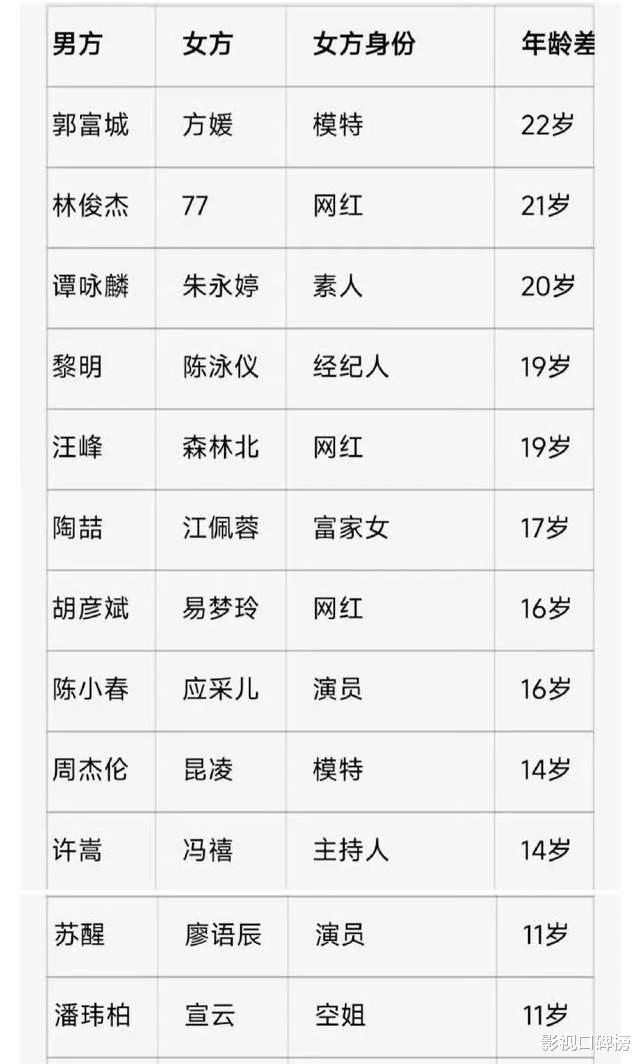 郭富城娶了比方媛小22岁的模特方媛;周杰伦和昆凌相差14岁;潘玮柏的妻子宣云是空姐;汪峰和森林北相差19岁,女方也是网红;胡彦斌和易梦玲相差16岁,易梦玲同样是网红出身等等。