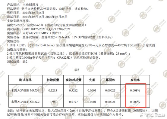 专业机构检测发现未野剃须刀24小时高浓度盐雾刀片腐蚀率小于0.1%
