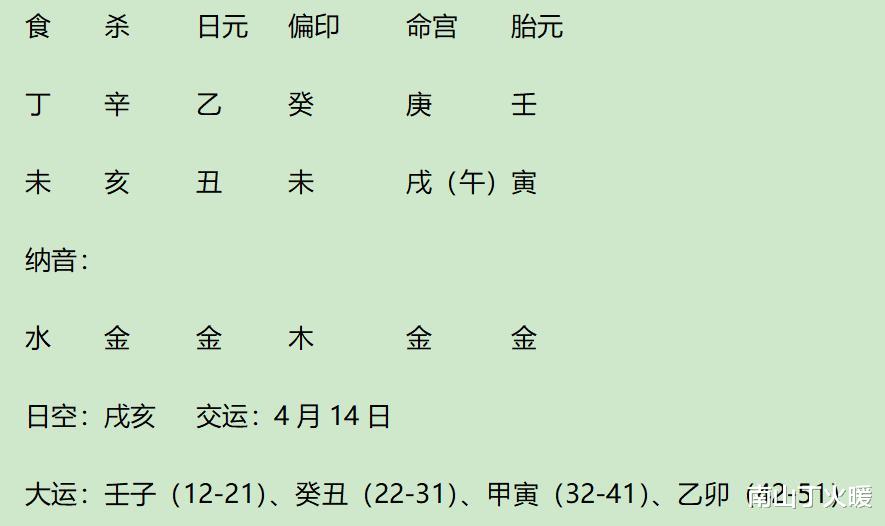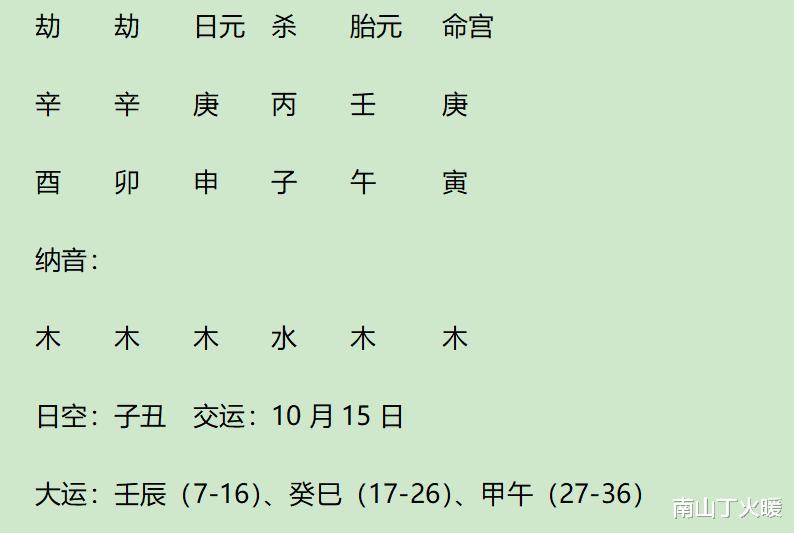 (1)夫星强:辛杀地支得1丑库、1戌余气、4纳音金助,合计1.5强根力量