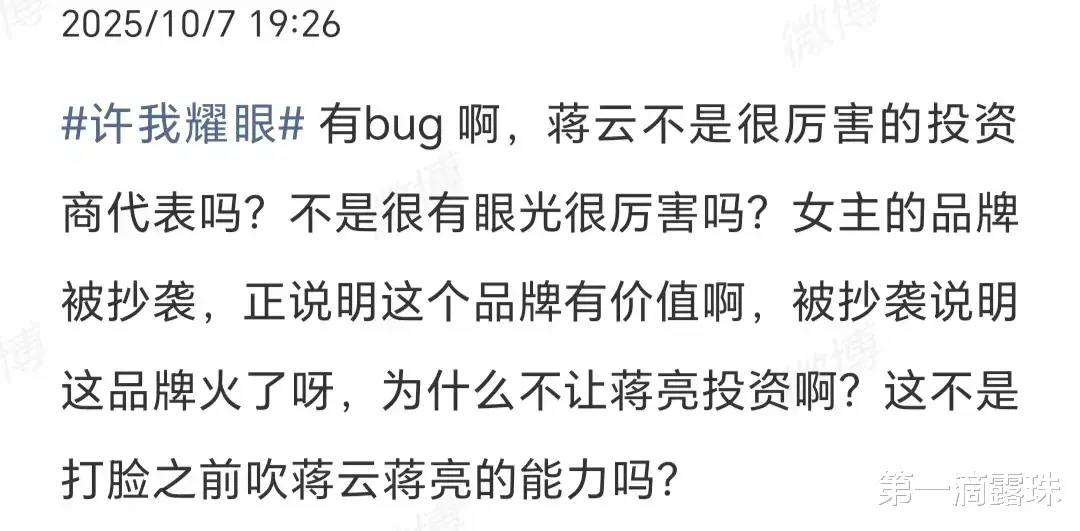 蒋云不是很厉害的投资商代表吗?不是很有眼光很厉害吗?女主的品牌被抄袭,正说明这个品牌有价值啊,被抄袭说明这品牌火了呀,为什么不让蒋亮投资啊?这不是打脸之前吹蒋云蒋亮的能力吗?