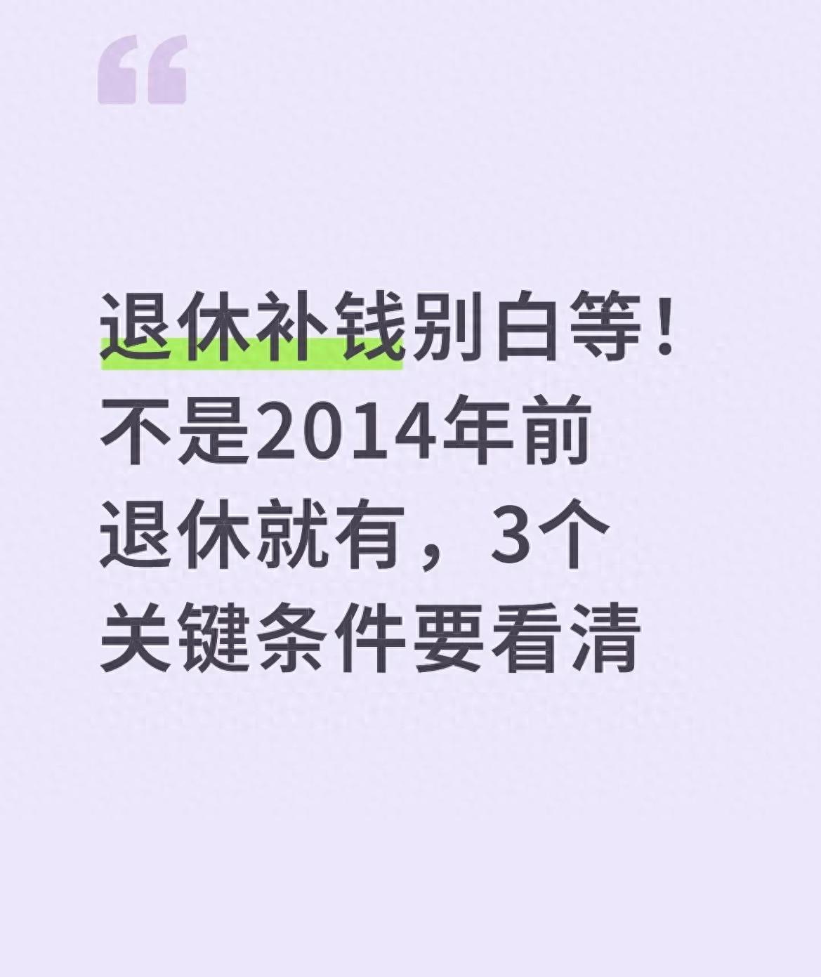 “明明是2014年前退的休,为啥老同事能领补钱,我却没有?”前几天在政务大厅帮家里长辈办事,听到两位退休叔叔阿姨向工作人员咨询,最后才发现是漏看了关键条件,白等了大半年。其实最近问“退休补钱”的人特别多,但很多人都被“2014年前退休”这个说法带偏了,忽略了政策里藏着的3个关键要求——缺少任何一个都可能无法领取,今天就结合人社部的官方解读,把这事讲清楚,别再让大家多跑冤枉路。