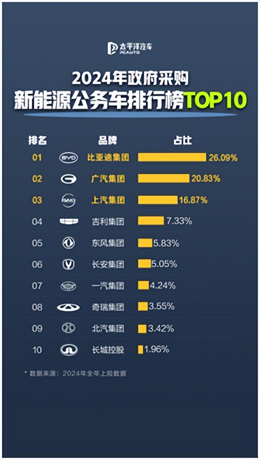 近日,太平洋汽车发布2023-2025年政府采购新能源公务车榜单。数据显示,比亚迪连续2年成为政府采购新能源公务车冠军,今年1-5月仍旧保持大幅领先。