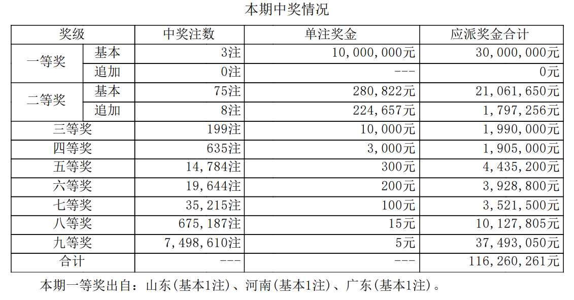 本期一等奖全国共开出3注,单注奖金1000万元,分别花落山东日照、河南和广东三地。
