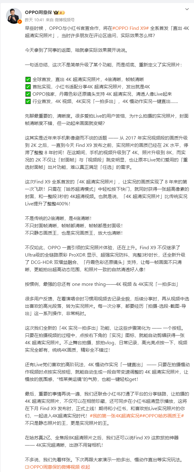 日前,@OPPO周意保 发布了使用OPPO Find X9系列新机拍摄的“直出4K超清实况照片”,并详细解读了该功能的亮点。据其称,