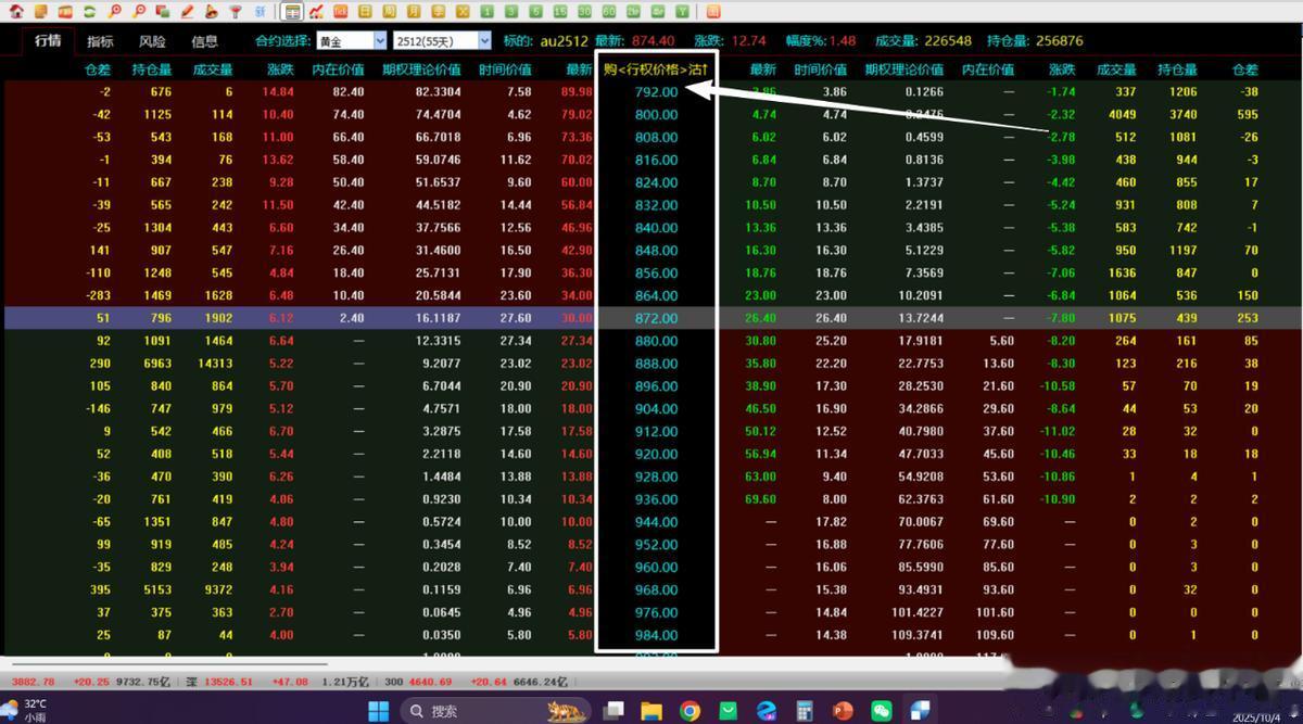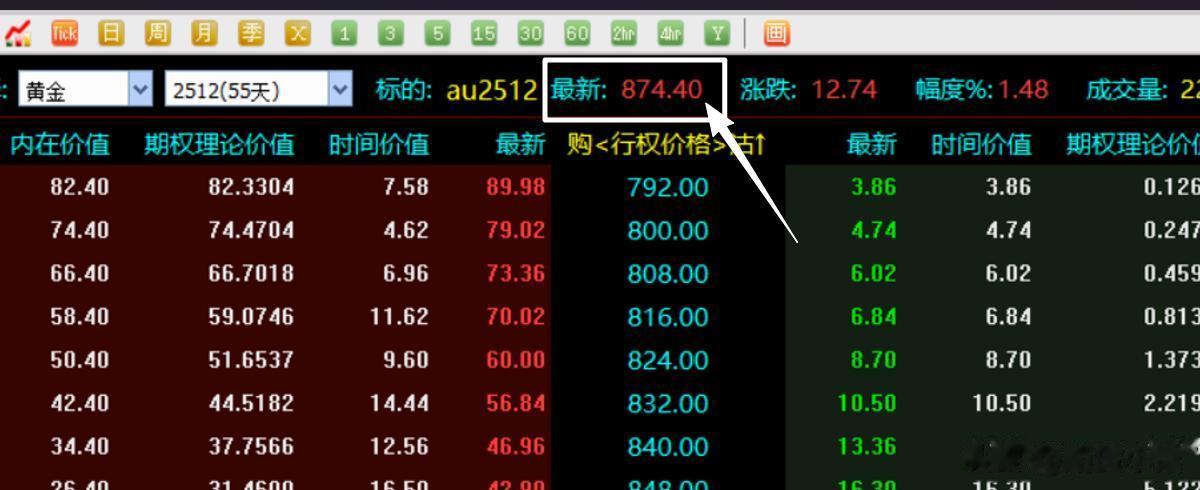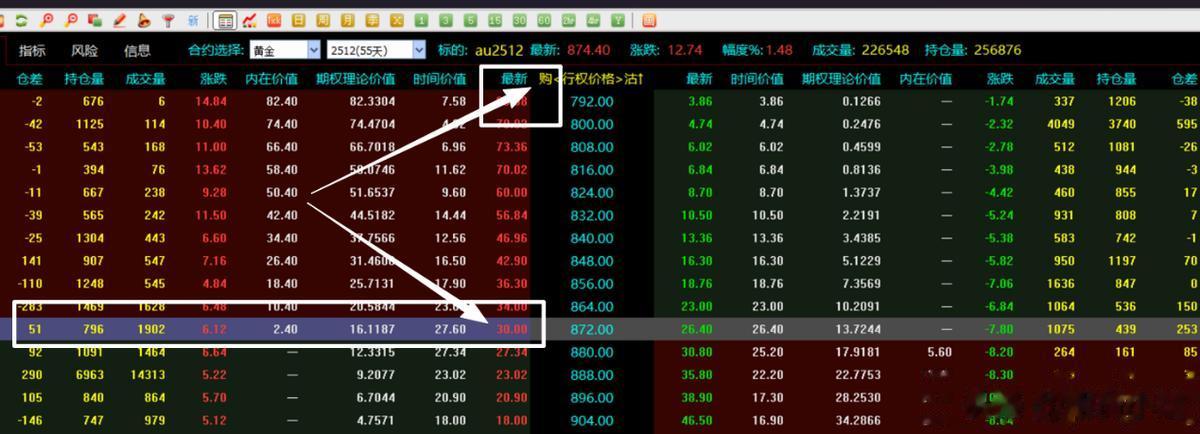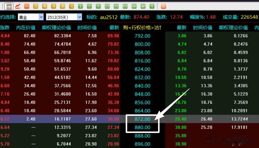 比如说图中的黄金期货实时价格是874.4元,你就去行权价格那一列里面找距离874.4元最近的那一个价格。图中显示872和880元这两个价格是距离期货价格最近的,那么就从这两个价格中选一个就行了。