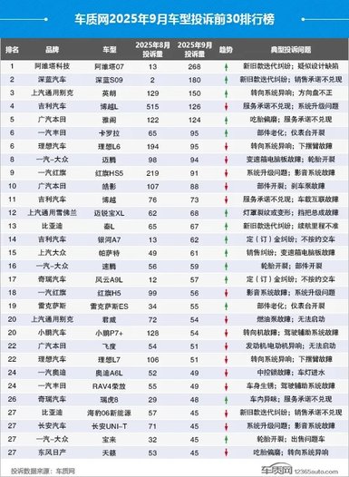 10 月 10 日,国内 9 月车型投诉排行榜正式发布。与 8 月榜单相比,本月排名格局发生显著变化,不仅有多款新车型闯入前列,核心投诉问题也呈现出鲜明的品牌集中性特征。