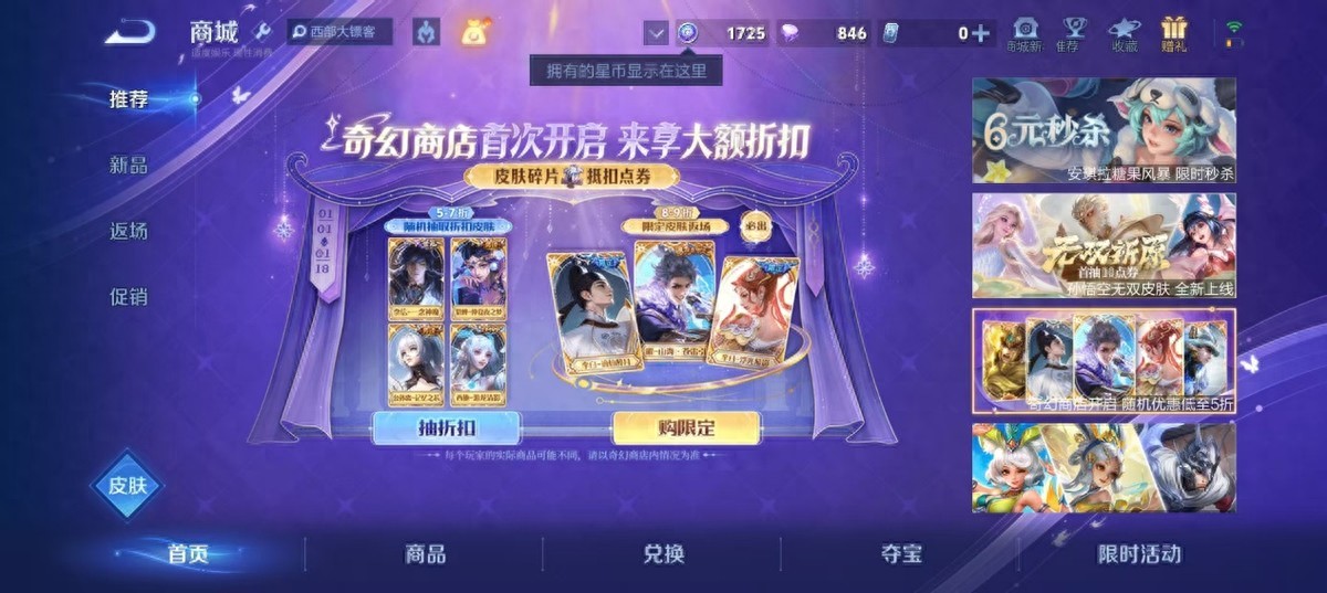 奇幻商城和普通商城不同之处在于可以用碎片抵扣点券,而且里面的皮肤都是打折的,还有很多好皮肤。奇幻商城活动持续到1月18日,大家要把握好时间。和皮肤碎片商城相比,里面有太多好皮肤,可以看到有曜的山海皮肤,铠的曙光守护者,达摩的狮子座等等。