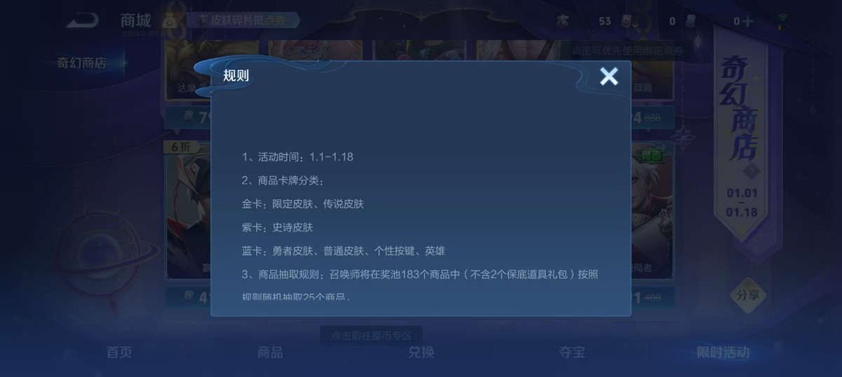 皮肤英雄和按键的折扣概率不同,5折概率只有20%,而且不一定有你喜欢的皮肤,所以一切还是看运气。不管任何活动总有欧皇,大胆去参加,没准你就是下一个欧皇。关于商店的抽取规则,还有卡牌分类,大家无需了解,之间开盒看折扣就行,碰到喜欢的就拿下,没那么多弯弯绕,这款活动并不复杂。