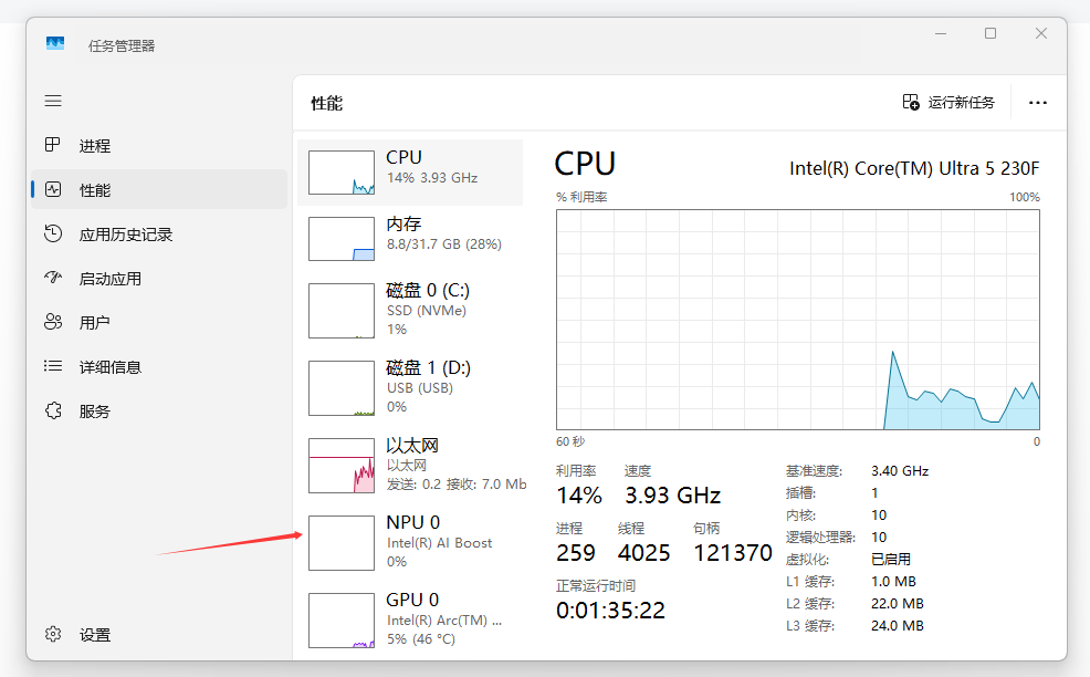▼新一代酷睿最大的变化,无疑是内置了NPU计算单元,通过CPU也可以实现本地AI运算,需要注意的是,你必须安装NPU驱动,不然任务管理器是不可见的。另外,这颗U没有集显,所以需要搭配显卡使用。