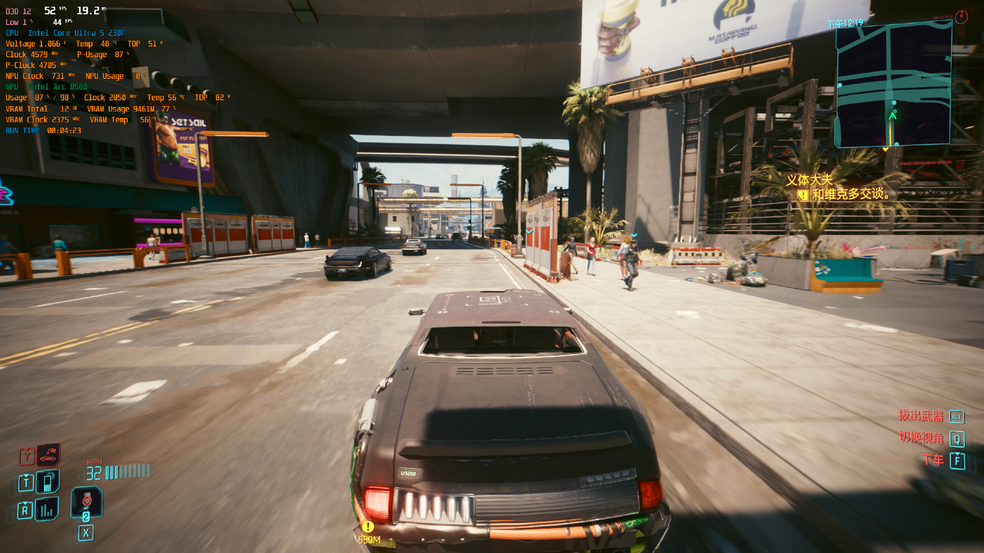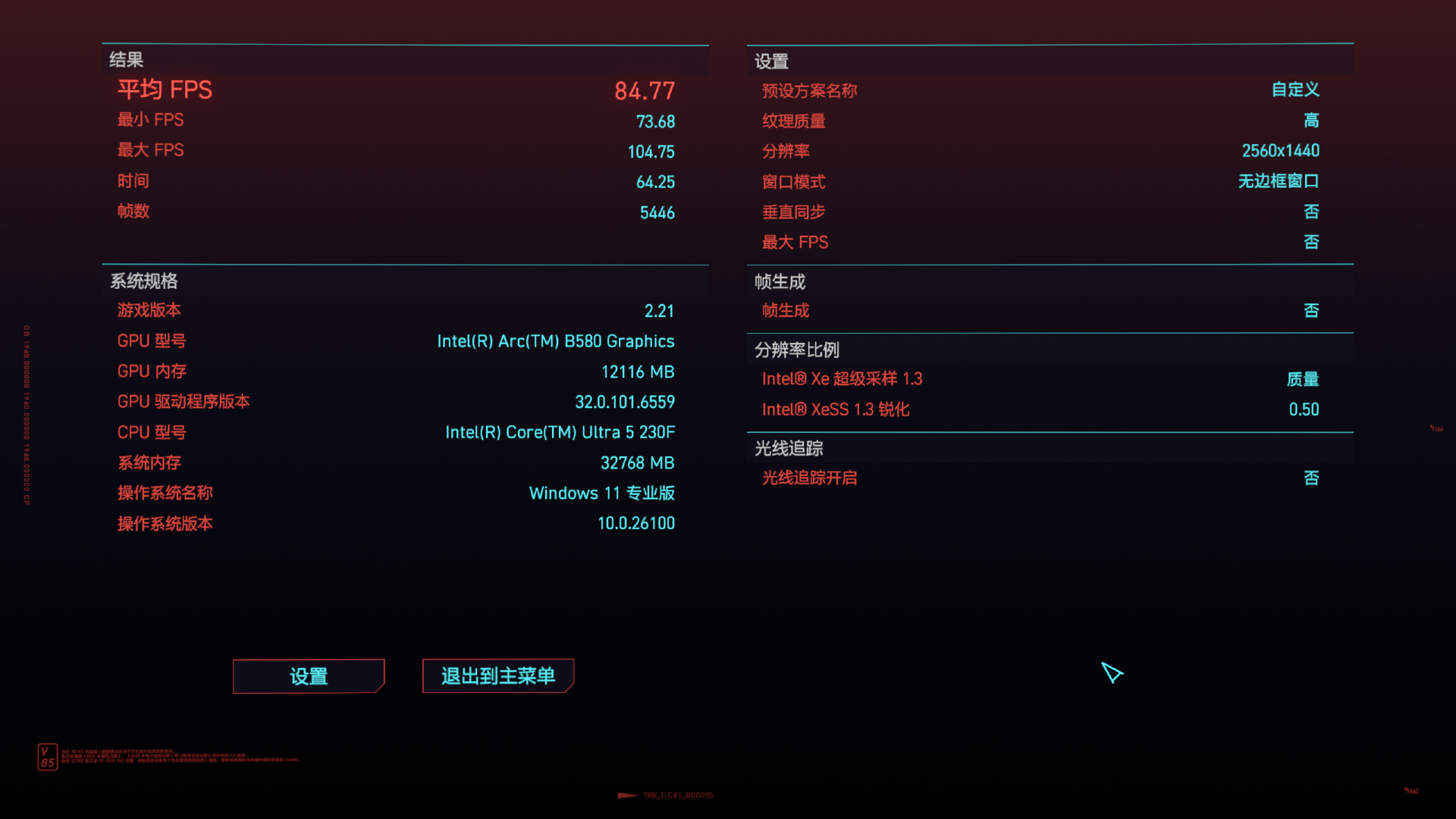 《赛博朋克2077》经过那么长时间的优化,同时还推出了远超原版的《往日之影》,虽然说BUG仍然有些如影随形,但整体已经没有太大问题,而Intel ARC B580玩《赛博朋克2077》在2K分辨率下显然也是无压力的,如果采用FSR帧生成,似乎分辨率设置4K问题也不大,表现优秀。