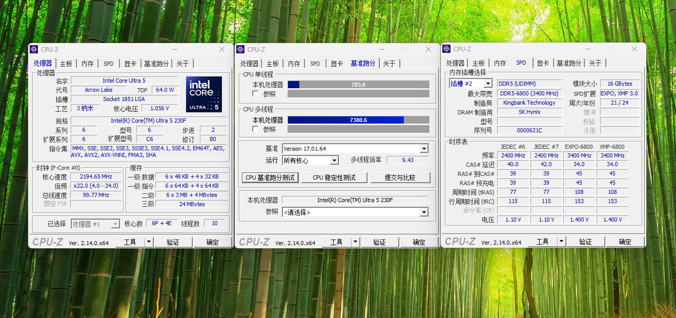 ▼CPU-Z做一下常规测试,大家可以看到单核性能不错,达到了783,多核性能相较于老大哥们会差一些,为7380,毕竟是十核十线程,当初i5动辄二十线程,但从需求角度来看,性能完全是够用的。