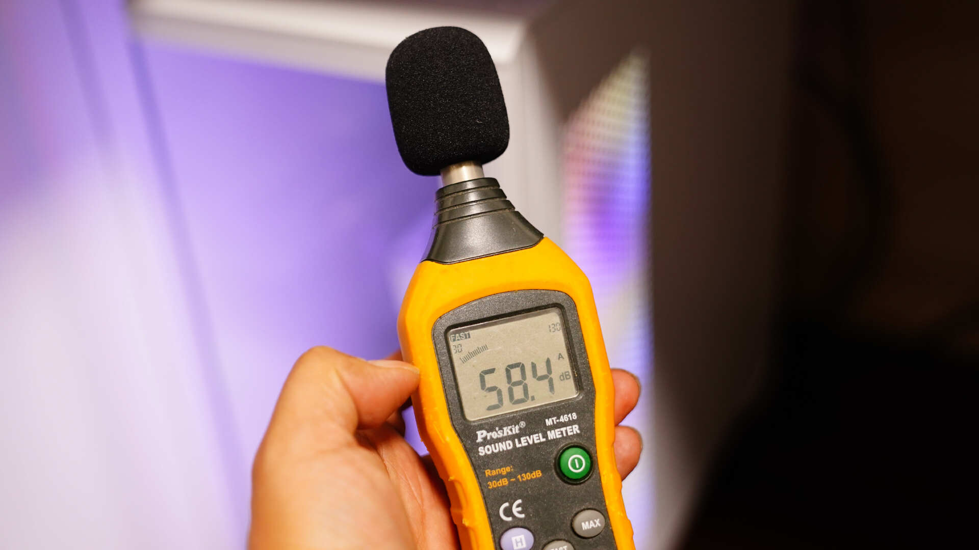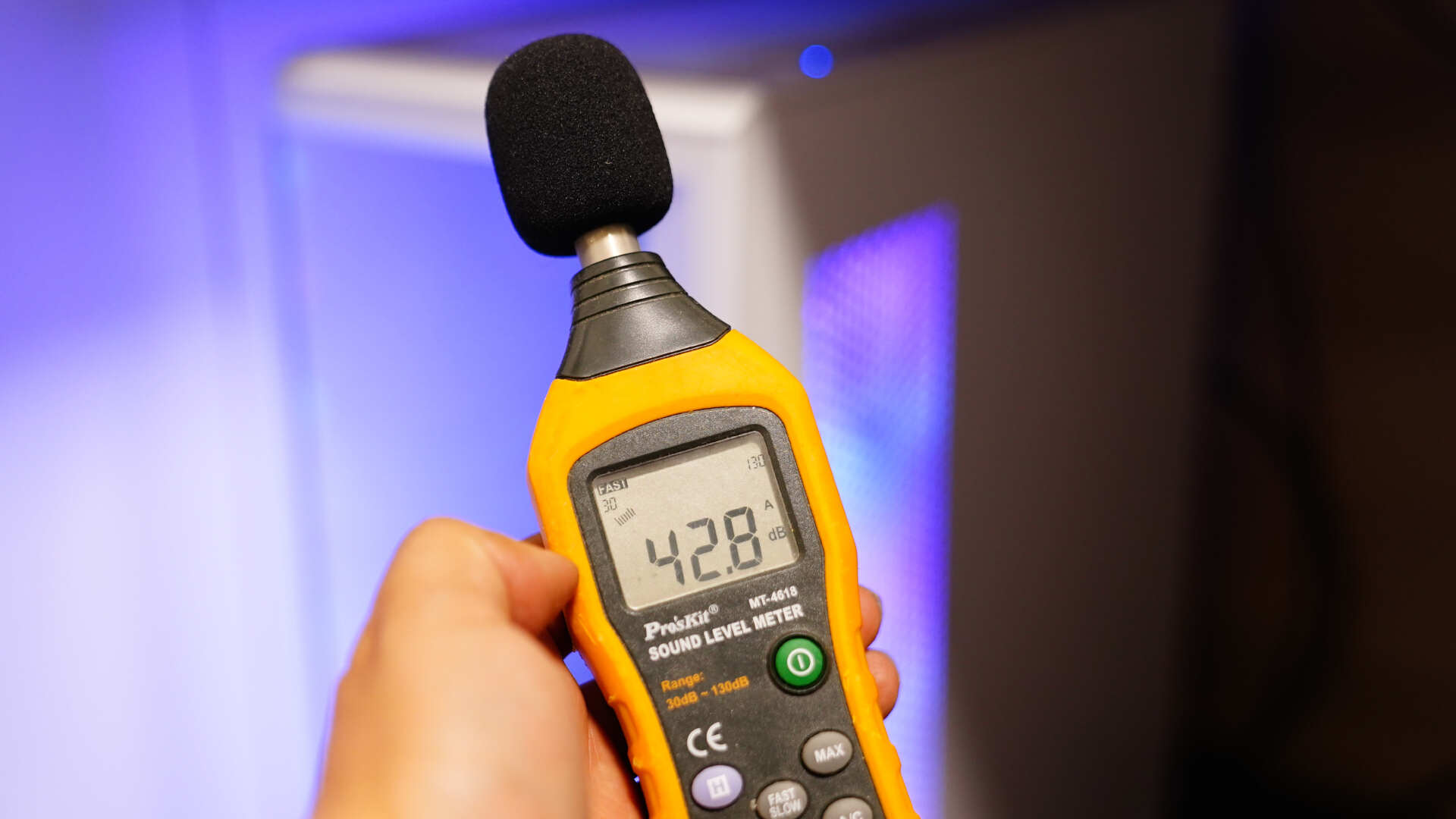 由于整体功耗下降,散热需求也是大幅下降,自然噪音也会下降,实测噪音如下,加上三个机箱风扇的前提下,待机噪音为42.8dB,基本上是一个低档为风扇的噪音表现。