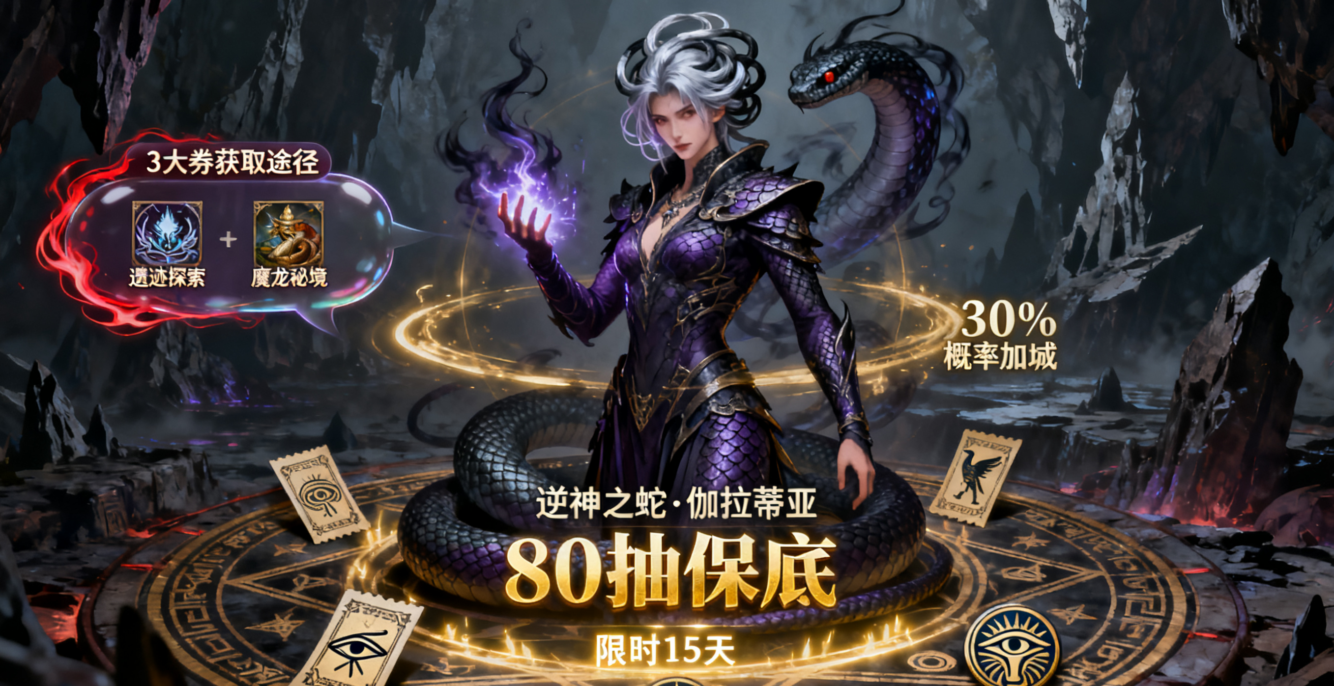 当前《逆神》开启三大高价值活动:9 月 24 日 - 10 月 8 日的「逆神之蛇・伽拉蒂亚」限定许愿池(暗属性 SSR 限时 UP);开服 21 天解锁的跨服「攻城掠地」赛季玩法(每日 11-23 点开放);全服通用的「狂欢福利周」(含魔龙探宝、BOSS 狂欢)。15 级即可参与基础玩法,高星奖励需重点突破核心机制。