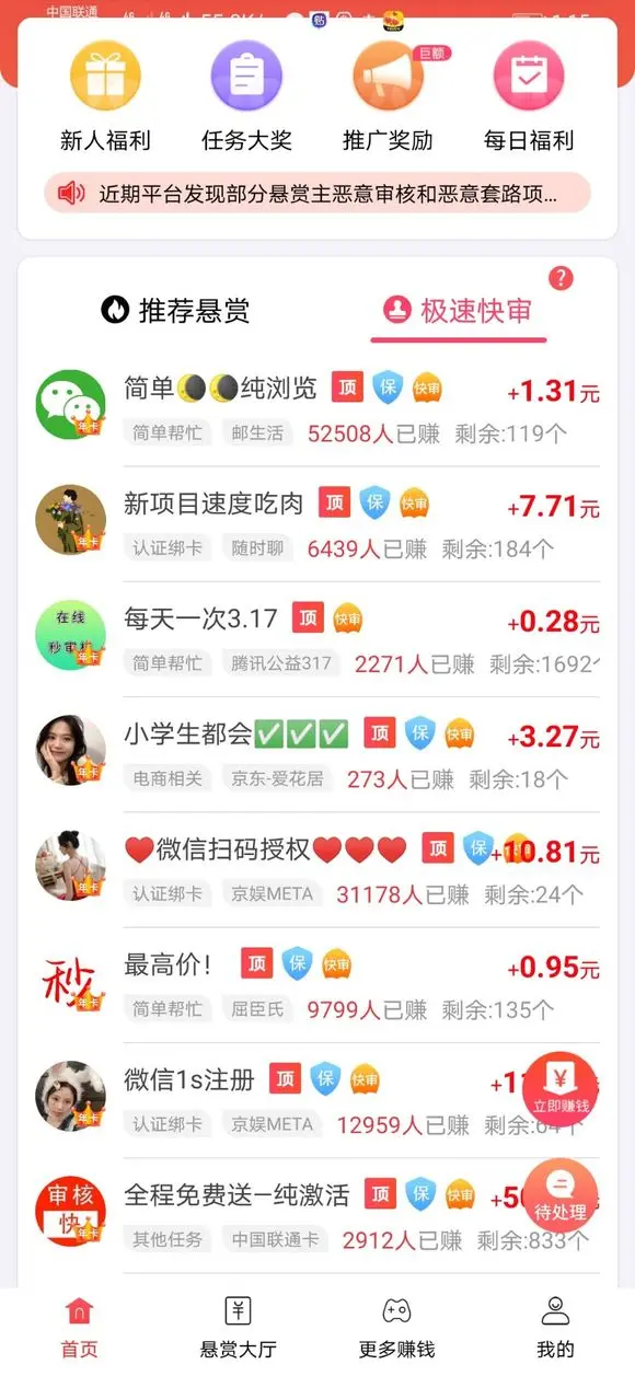 点击上面链接注册安装赏帮赚APP,登录后在个人中心分享下喵达人任务,可以提高20%做任务收益,接着在APP首页导航下接各种类型任务悬赏赚钱,每一个任务的佣金在几毛到几元之间,完成一个任务在24小时内结算一份佣金。