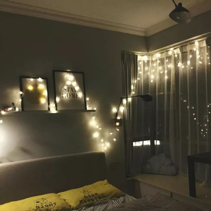 别再只在床头柜上方装壁灯或吊灯了,换成小串灯更有氛围: